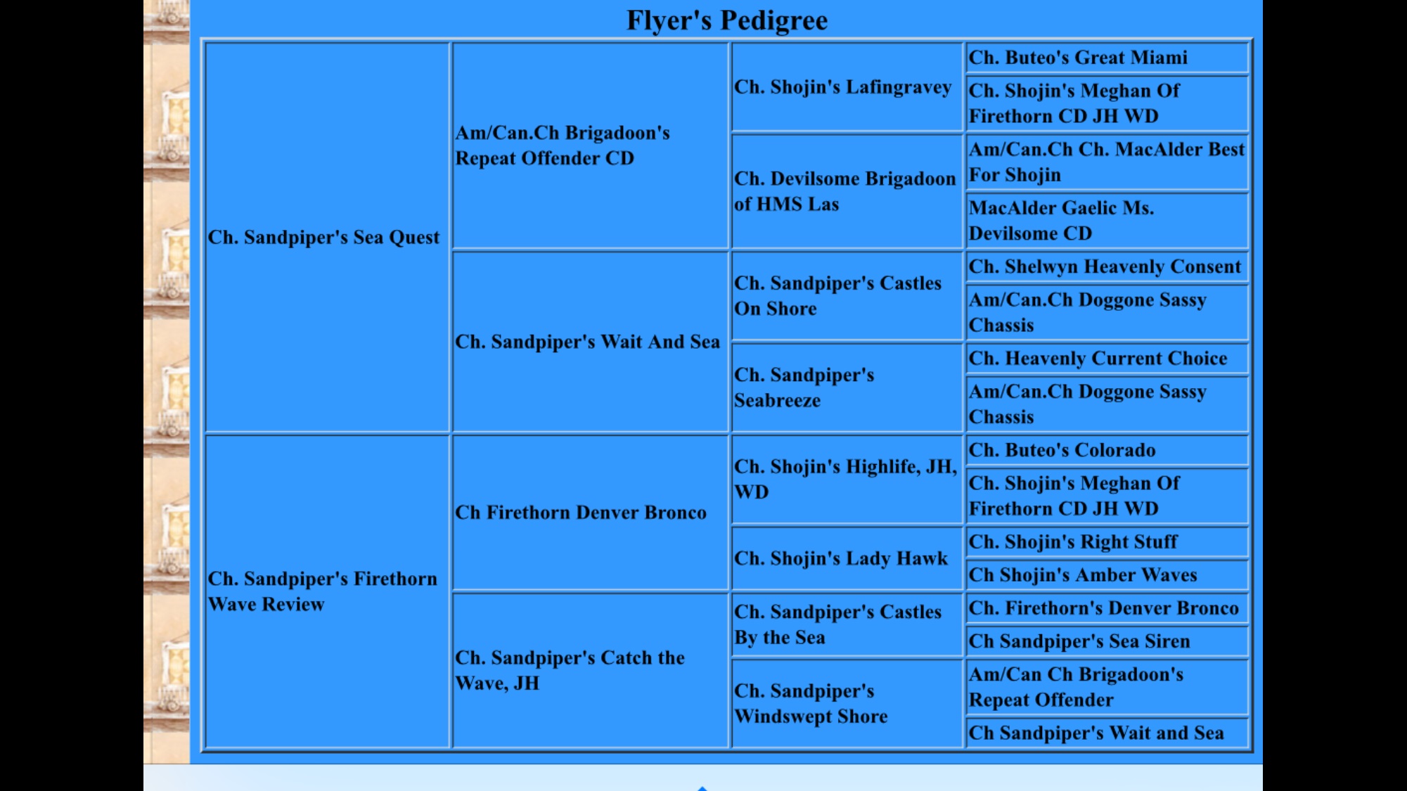 2013![]() GCH BAKER STREET GLORIA SCOTT 'Gloria' PEDIGREE ![]() GCH GILNOCKIE'S SEVENSTRONG PEDIGREE ![]() CH HERNWOOD MAGIC FORMULA ![]() CH SANDPIPER'S DASHING IN THE DUNES 'Dash' PEDIGREE ![]() GCH STILMOOR FACINATION FOR HEATHERBRAE |