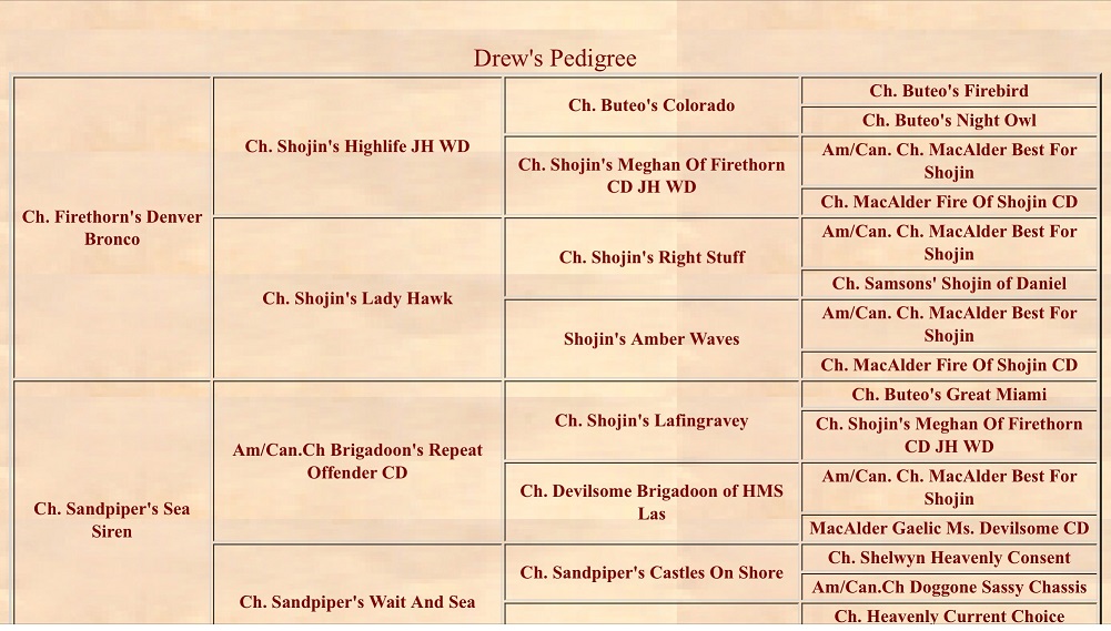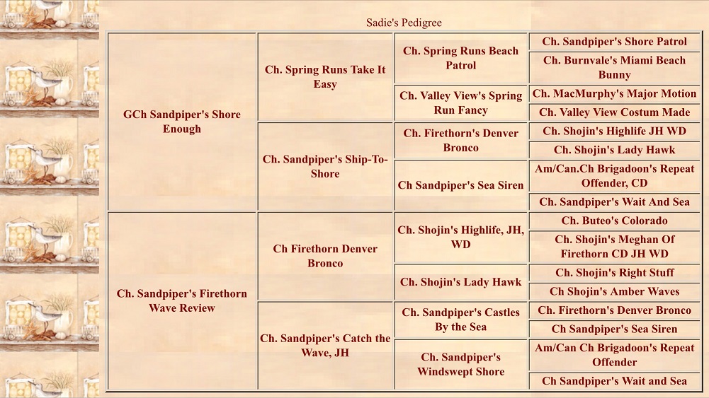 2013![]() GCH BAKER STREET GLORIA SCOTT 'Gloria' PEDIGREE ![]() GCH GILNOCKIE'S SEVENSTRONG PEDIGREE ![]() CH HERNWOOD MAGIC FORMULA ![]() CH SANDPIPER'S DASHING IN THE DUNES 'Dash' PEDIGREE ![]() GCH STILMOOR FACINATION FOR HEATHERBRAE |