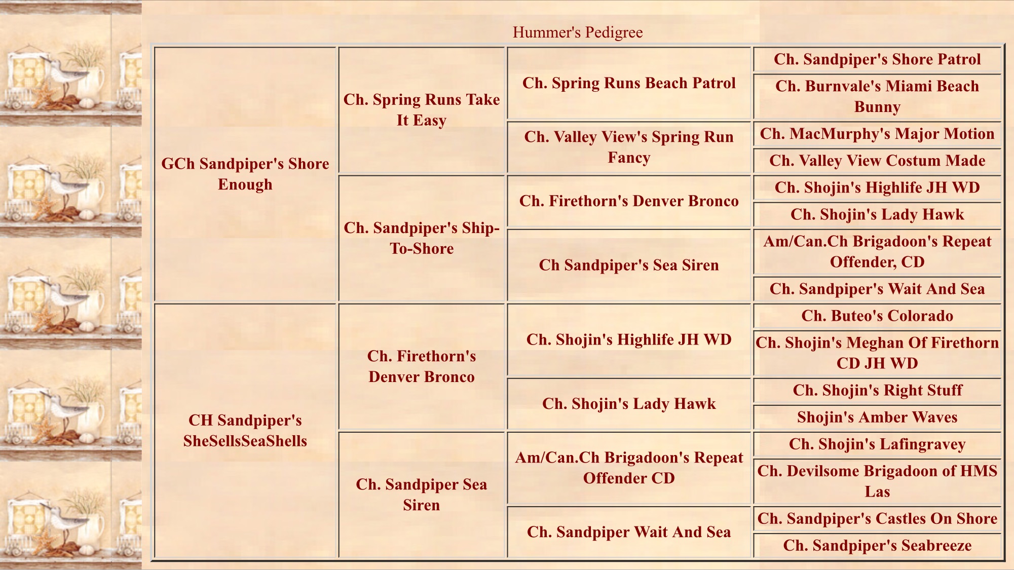 2001![]() SANDPIPER'S CASTLES BY THE SEA (BOW) 'Drew' PEDIGREE |